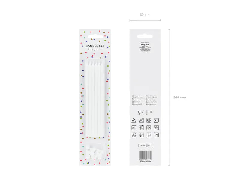 Set belih rođendanskih svećica za tortu (14 cm, 12 kom) — klasične, glatke i elegantne svećice idealne za rođendane, venčanja, jubileje i svečane kolače.