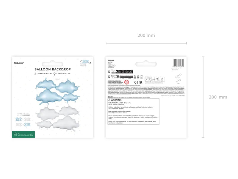 Folija balon dvostran (belo - svetlo plava) sa motivom oblaka, dimenzija 99 × 52 cm nakon napumpavanja — jedna strana u beloj, a druga u nežnoj svetlo plavoj boji. Savršen je kao pozadina za foto-zonu, party dekor ili baby shower dekoracija, posebno u temama inspirisanim nebom i oblacima.