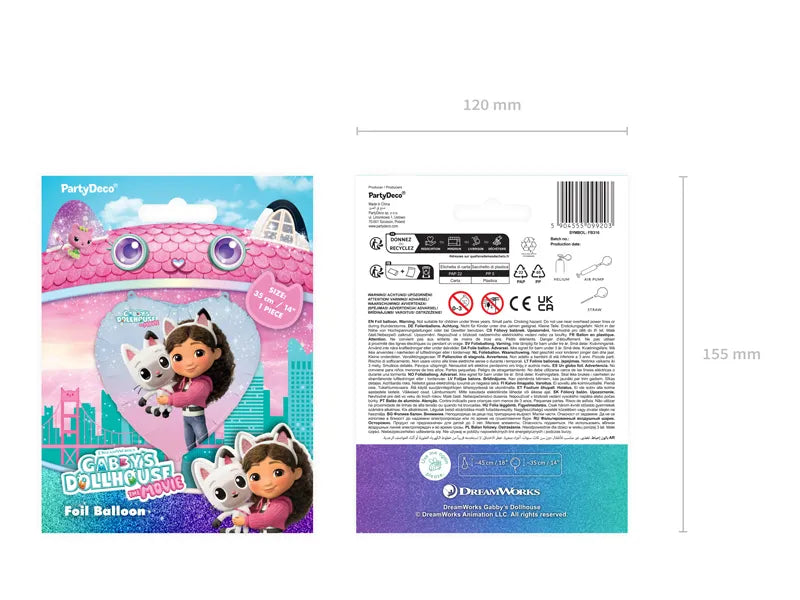Folija balon u obliku srca sa motivom iz crtića Gabina Kucica za lutke (Gabby’s Dollhouse), prečnika ≈45 cm nakon napumpavanja — vesela, šarena dekoracija idealna za dečije rođendane, tematske žurke i party dekor.
