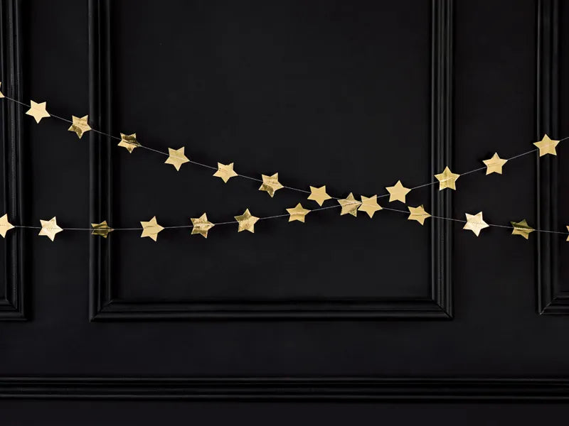 Zlatna dekorativna girlanda sa zvezdicama dužine 3,6 m — svečana i efektna dekoracija za rođendane, venčanja, novogodišnje žurke, tematske proslave i foto-zone. Dodaje blistav i glamurozan detalj svakoj dekoraciji prostora. 1 kom u pak.